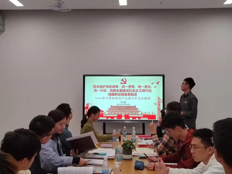 预备党员接收大会结束后,党支部开展了党的十九届六中全会精神的集体学习。李金鹏同志以“坚决维护党的领导”为主题,从加强党的领导的历史逻辑与现实启示两个方面分析阐述了坚持和加强党的全面领导的重要意义,带领各位同志更加深入认识到党的领导、党中央集中统一领导和确立习近平同志在党中央的核心地位是内在统一的,激励大家将“两个确立”转化为“两个维护”,保持思想自觉、政治自觉和行动自觉。随后,党支部各位同志就这一主题开展了热烈的讨论,均表达了对党的领导的深刻看法。