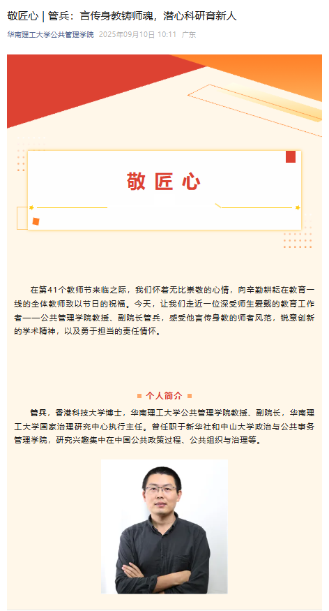 为充分挖掘高素质教师模范典型和先进事迹,学院微信公众号发布《敬匠心|管兵:言传身教铸师魂,潜心科研育新人》的文章推送,发挥优秀高素质教师榜样的立德垂范效应,共同营造崇尚师德、潜心育人的优良风尚。