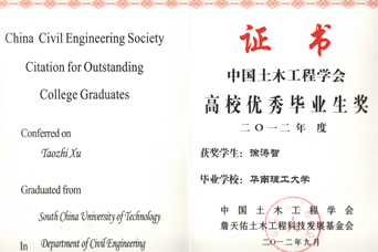 据悉,“詹天佑土木工程高校优秀毕业生奖”是全国土木工程专业高校毕业生最高奖,每年从全国400多所设有土木工程专业的高校应届毕业生中推荐评选,2012年荣获该奖的毕业生仅20名。(图文/土木与交通学院)