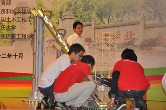 参赛队首先进行两天共12小时的现场模型制作,再进行1天半的加载测试比赛。在强大的压力下,我院学生克服种种不利因素,稳定发挥,通过现场制作、专家打分、叙述答辩、加载试验多个环节的激烈角逐,最终凭借最轻的结构和优异的抗冲击性能试验取得一等奖。
