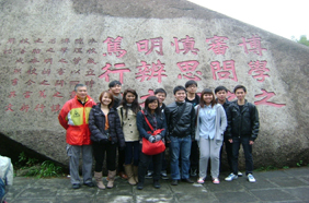 双方师生合影留念 | 客人在校训石前合影留念 |