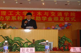 12月25日,土木与交通学院在交通大楼604报告厅隆重举行“工程力学系校友奖助学金”颁发仪式。沃尔沃汽车公司全球高级副总裁兼中国区董事长沈晖、广州市俊峰旅游投资有限公司董事长徐广流等力学校友代表,学院负责人和工程力学系老师代表出席了仪式,62名获奖学生代表参加了颁奖仪式。