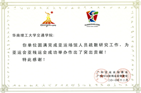 近日, 广州亚运会组委会、广州2010亚残运会组委会联合表彰华南理工大学土木与交通学院,以感谢土木与交通学院在2010广州亚运会和亚残运会场馆建设与运行保障工作中作出的突出贡献。