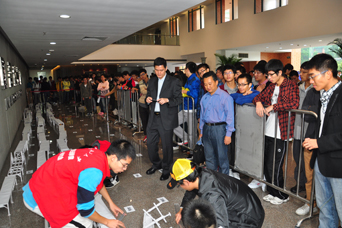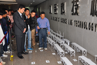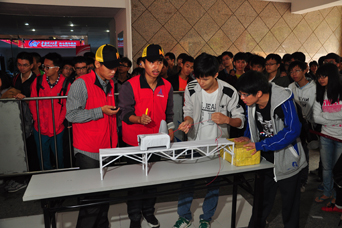 本次大赛分为专业组和业余组两个赛区,专业组的题目与上届比赛相同,为承受动荷载和静荷载的不对称双跨桥梁实物模型设计,而业余组题目则改为承受均布荷载作用的多层平顶大厦架构模型设计。大赛分四个小区域同时进行,专业组和非专业组制作的模型同时分区进行承重测试。上午的初赛通过较低程度的承重测试将淘汰一部分作品,通过的作品则可以参加下午的加重测试复赛。在主持人的指挥下,一架架作品被有序地抬进各个比赛点。参赛队员一人稳稳地扶住模型,一人小心地向模型上放置砝码,另外的队员则在旁边指挥。“加!再加!”队员和围观的学生齐声为选手们呐喊助威,全场一片紧张沸腾的气氛。在经过近一天的角逐后,华南农业大学、广东工业大学和华南理工大学分获前三名。