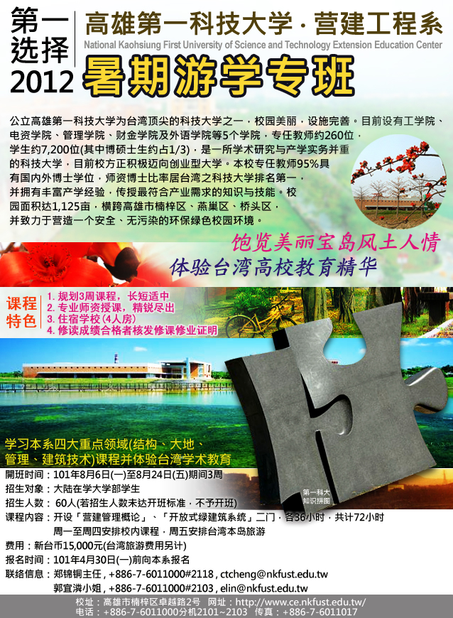 台湾高雄第一科技大学营建工程系希望招收我院自愿报名的在读学生参加该系组织的“2012年暑期游学专班”。