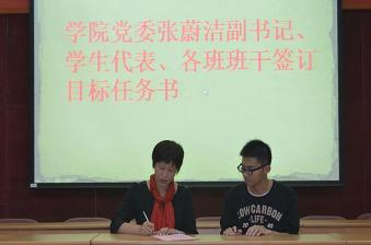 学风,是读书之风,是治学之风,更是做人之风,这是一所大学的气质和灵魂。学院张蔚洁副书记在宣布第三期互助课堂正式启动的同时,也介绍了本次活动的目的和宗旨,对2012年首届互助课堂所的成绩给予了充分的肯定,也对今年学院优良学风建设提出了更高的要求。为了进一步加强学风建设,营造良好的学习氛围,发挥学生党员的模范带头作用、学生帮扶志愿者的爱心帮扶作用,班委及团支部管理和监督作用,学院党委张蔚洁副书记与学习部部长共同签订了优良学风建设目标任务书,号召全体学生干部结合自身角色优势,充分发挥主动性作用履行管理督促职责,并详细介绍了2012—2013年第二学期“创优良学风 展专业风采”实施方案与第三期砼人互助课堂实施细则。