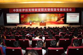 讲座中,倪坚大使详细介绍了外交工作的基本情况,运用正反两个实例说明外交分析研究的重要性以及外交官工作的艰巨性;解读了老中东问题的起源,新中东问题的根源及其出现所导致的后果;深刻分析了伊拉克近代重要历史事件以及当前伊拉克的安全形势;发表了对公共外交的看法,指出我们全体国民应积极主动参与公共外交,减少其他国家对我国的误读;大家应从自身做起,维护国家形象。倪坚大使还就同学们关心的美国在伊拉克是否真正撤军、伊拉克人民对伊拉克战争的态度以及当前朝鲜半岛局势等热点问题,一一作了解答。