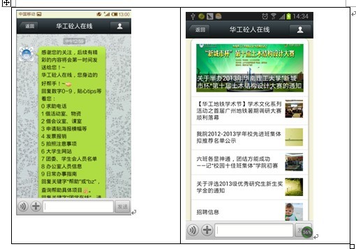 想第一时间收到放假时间安排、学院办公信息或者学院学生类活动重要提醒等信息么?只要您使用的是智能手机,并安装了微信软件,就可以将“华工砼人在线”官方微信加入到联系人中。目前平台定期向微粉们发送学生类重要活动提醒及宣传,有日常办公电话查询,活动申请注意事项等实用信息,学院办公信息,及日常的办事指南等,并且每天发布团委、学工通知,招聘提醒等,只要您按下提示键便可以得到您想得到的相关信息。同时,您也可以随时在微信平台咨询问题,微信平台将自动回答您所提出的问题,如果未能做出回答,我们将及时更新问题库并将答案发送给您,随着提问不断增多,答案将会越来越丰富。相信“华工砼人在线”微信平台会给您带来更多更快的便利。