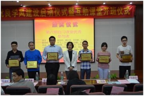 接着,学术部部长介绍了往期互助课堂实施情况,并向大家说明第七期互助课堂实施细则。随后学院团委书记王燕林老师宣读表彰决定,在优秀学生颁奖仪式上,张蔚洁副书记先后为 “优秀志愿者”、“优秀被帮扶者”、“优秀参与者”“先进班集体代表”颁发了证书。