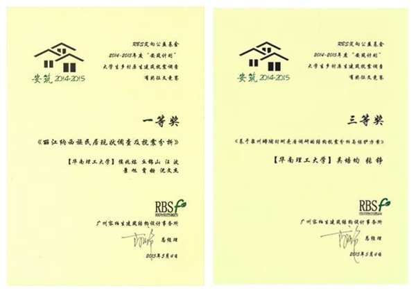 5月4日,由广州容柏生建筑结构设计事务所(简称RBS)发起的RBS定向公益基金(简称RBSf)2014-2015年度“安筑计划”大学生乡村原生建筑抗震情况调查有奖征文的评选工作落下帷幕。土木与交通学院的两支参赛队伍,2012级土木工程本科生侯兆熔、丘锦山、汪波、沈文杰和建筑学院2013级本科生景旭、贾姗在季静教授的指导下完成的作品《丽江纳西族民居现状调查及抗震分析》获得该竞赛一等奖(奖金6000元);土木与交通学院2012级本科生吴培均和建筑学院2011级本科生张铮在土木与交通学院韩小雷教授、郭文瑛讲师的指导下完成的作品《基于泉州蟳埔村蚵壳厝调研的结构抗震分析与保护方案》获得该竞赛三等奖(奖金3000元)。