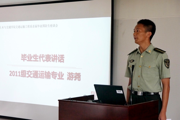 “国防生,生为国防”——记录着曾经我们多少汗水与拼搏,努力与成长的国防生视频播放中,老师同学们入场完毕。首先由毕业生代表讲话。第一位毕业生代表,2011级交通运输专业国防生游尧,总结与汇报四年来在军政训练与专业学习的优异成果,获保研资格于国防科技大学继续研究学习,以其大学四年学习与成长的丰硕成果回报老师,回报学院,回报选培办;第二位毕业生代表2011级交通工程专业国防生赖学能,他以自己的改变与收获,讲述四年的大学国防生生活带给自己的锻炼与成长,感恩学院,感恩国防生这个大集体带给他的陪伴与帮助。2012级交通运输专业国防生胡明涛作为在校生代表发言,对师兄师姐表达了毕业祝贺以及祝福。