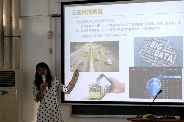 首先,马莹莹老师做了题为“交通世界的发展与未来”的主题报告,主要介绍了铁路、公路、水运、航空、管道五大运输方式的发展前景,城市交通各种运输模式的现状及未来发展趋势,同时给博白中学的师生讲解了我国在智能交通诱导、车联网、交通大数据等交通前沿技术的应用及研究情况。