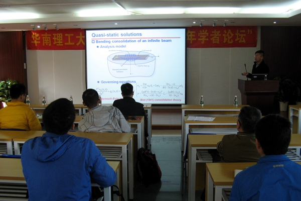 史吏博士则介绍了其在加拿大麦吉尔大学的博士后研究工作,做了题为“梁和饱和半空间的静动力相互作用”的报告,报告中他采用地基等效刚度法,结合傅立叶和拉普拉斯变换分别解析推导了饱和半空间上覆无限长、有限宽欧拉梁在阶跃点荷载和移动点荷载作用下的挠曲沉降和动力响应。