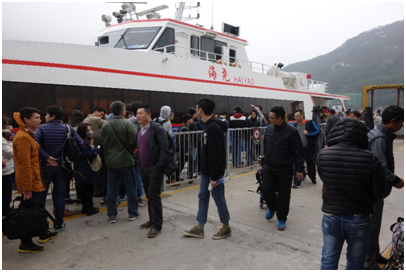 3月15号上午 9时许,师生一行在香洲港乘坐高速客轮前往万山岛。万山岛位于珠海市金湾区,距离香洲港码头直线距离30多公里。摆渡船是一艘双体船,一路上虽然风浪不大,但很多人出现了强烈的晕船反映。但大家还是克服困难历经两个小时的航程抵达万山岛。同学们乘坐双体高速船,对这种高性能船舶的耐波性和舒适性有了切身体会。在此过程中,同学们近距离观察了各类渔船、补给船、灯船,同时也在穿过港珠澳大桥桥墩的时候欣赏了这座跨海特大型桥梁的外观构造。