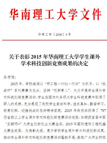 学院大力开展学生课外科技创新竞赛活动,效果显著,荣获2015年度华南理工大学学生课外学术科技创新工作“优秀组织奖”(全校10个单位)。