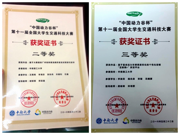 5月21-22日,第十一届全国大学生交通科技大赛在中南大学铁道学院校区举行,华南理工大学土木与交通学院的两组参赛作品《基于大数据的广州地铁客流拥挤度实时预测与发布》以及《基于富余运力车辆调度优化的个性化定制“互联网+”拼货平台》表现突出,分别获得二等奖和三等奖的优异成绩。
