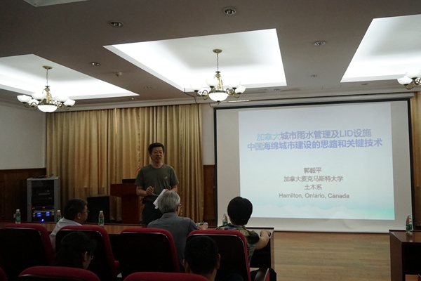 2016年5月27日上午,水利水电工程系在7号楼二楼大报告厅举行了国际“海绵城市”交流讲座。来自加拿大McMaster University的郭毅平教授应邀做了三个小时的题为“加拿大城市雨水管理及LID设施 中国海绵城市建设的思想和关键技术”的精彩报告。中山大学水资源与环境系的陈子燊教授、中山市水务局规划与计划科的林祯兆科长、广东省水利勘测设计研究院以及广州市水务规划研究院的部分工程师也应邀参加了此次讲座。学院王湛副院长、周小文系主任、黄国如教授、程香菊教授、刘曾美副教授、王兆礼副教授、薛娈鸾博士、胡海英博士以及2013级水工专业的本科生和部分研究生济济一堂认真听取了郭教授的分享。
