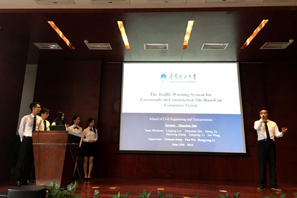 在激烈的决赛展示现场上,华南理工大学的四支队伍不惧强敌,冷静发挥,用流利的英语口语和富有趣味性的展示流程将各自的作品完整的呈现出来,并沉着应对在场各国评委的问题和出现的各种突发情况,展示出了严谨的思维水平、极高的专业知识素养和展示能力,获得了在场的评委以及参赛师生的一致好评和高度赞扬。以获得一等奖的小组为例,他们通过运用小视频、舞台剧等多种展示形式,将本组的成果形象生动地展示出来,给评委和观众留下了深刻的印象。在展示后的点评中,来自南加州大学的评委说:“这一组的展示使全组同学都参与到其中,体现了这组同学优秀的团队合作精神”。而来自新加坡国立大学的评委则评论:“建设行业的未来创新在于年轻一代,该组的展示很好地体现出了这一点”。