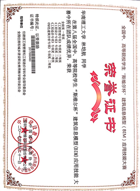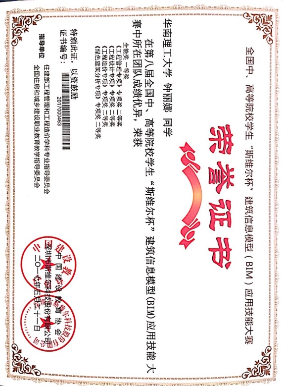2017年5月20日-21日,第八届全国中、高等院校学生“斯维尔杯”建筑信息模型(BIM)应用技能大赛总决赛在浙江理工大学(南方赛区)、吉林建筑大学(北方赛区)同步举行。由土木与交通学院工程管理专业的林垲航、钟丽娜,土木工程专业的欧子健、王毅,建筑学院的梁智怡,组成的“珠水云山”队作为华南理工大学唯一代表队,荣获大赛“全能一等奖”以及四个“专项二等奖”。
