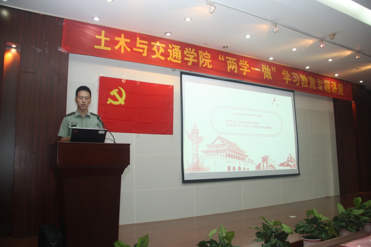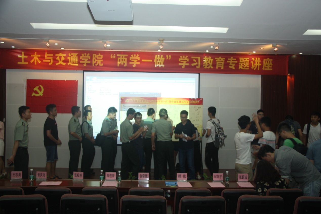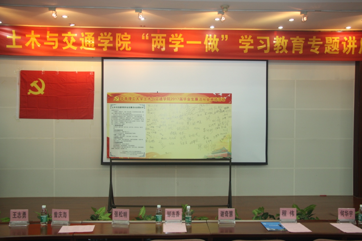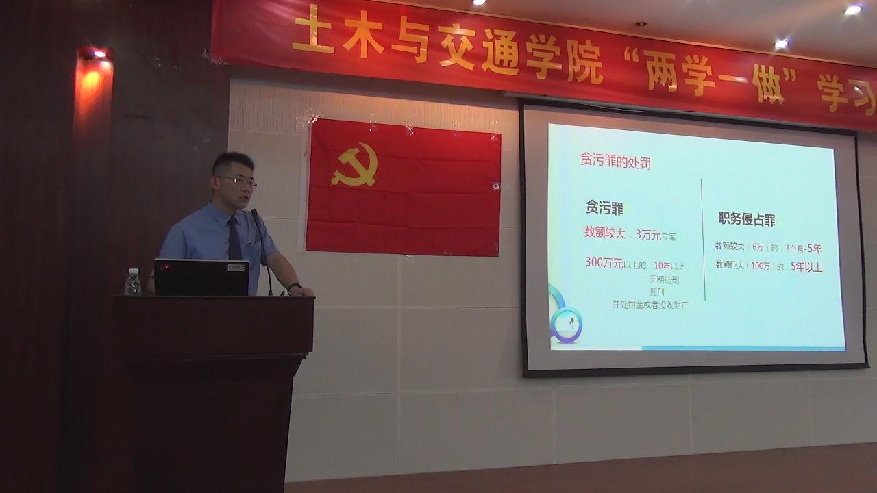 6月15日下午,土木与交通学院“两学一做”学习教育专题系列活动之2017届毕业生廉洁从业教育活动暨新党员入党宣誓仪式在交通大楼二楼学术报告厅举行。活动特别邀请到白云区人民检察院反贪局综合预防科科长程伟检察官为党员师生授课。同时受邀出席活动的还有纪监办副处级纪检监察员谢奇慧、邹连香,正科级纪检监察员何华宇,以及学院兼职组织员张松明、曾庆海和王志勇等退休教工党员。会议由张蔚洁副书记主持,学院2017届全体毕业生党员、2017年新发展学生党员及全体专兼职辅导员260多人参加了学习活动。