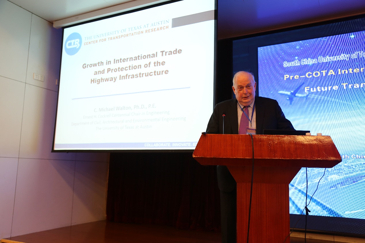 首先,由美国工程院院士、德克萨斯大学奥斯汀分校Michael Walton教授作“国际贸易增长与公路基础设施保护”的主题报告。主要分析了国际贸易增长对集装箱运输的影响以及如何在保护公路基础设施的同时保障对国际集装箱日益增长的需求,提出基础设施友好型的卡车或底盘设计可以减少重型集装箱卡车对道路桥梁的损害。