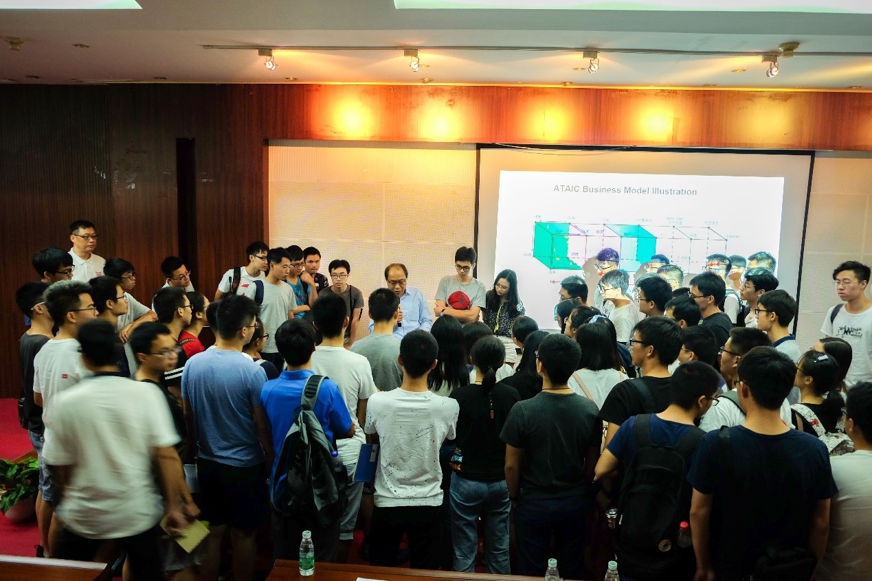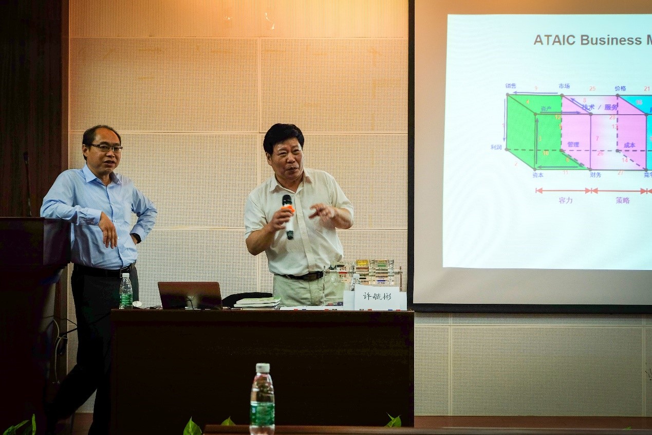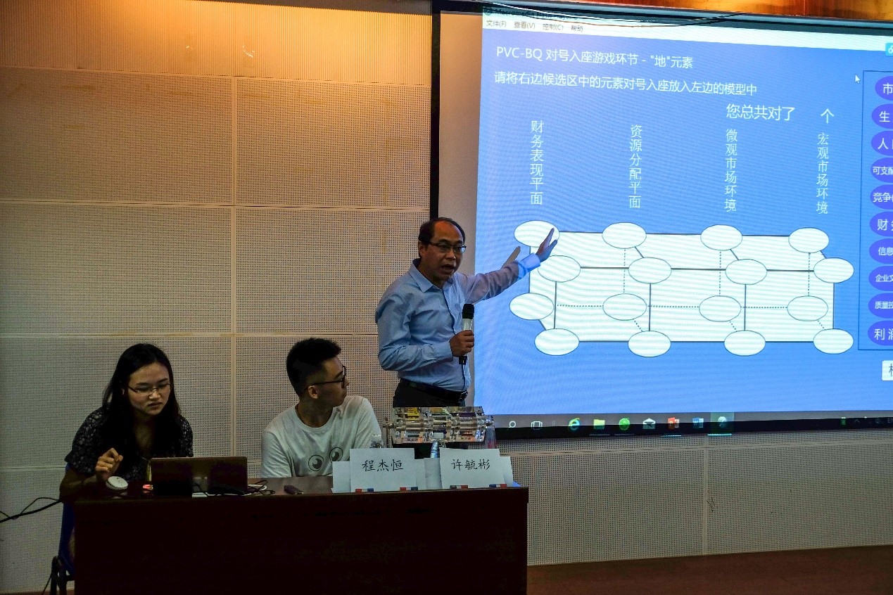 许教授团队成员程杰恒教授向同学们介绍了基于利量衡经济哲学理论框架的商业工程学体系,而发展形成的BE技术核心——包括宏观经济、企业管理和商业智能三个主要方面的企业决策与管理的PVC-BQ系统,该系统通过复杂众多的44个关键商业元素、80条相互串联关系、11层层递平面及36个相关综合平面,系统地呈献出商业总体观,并通过精心设计制作的人机交互学习软件和实体化的教学教具,将整个复杂的商业系统分析过程化繁为简,提供给学习者一种直观、清晰、实用的学习手段和方式。程杰恒教授通这些软件和教具,现场与参会学生进行了互动,生动形象地为学生们分享了用PVC-BQ企业决策与管理系统进行企业商业分析和管理的过程和方法。