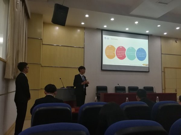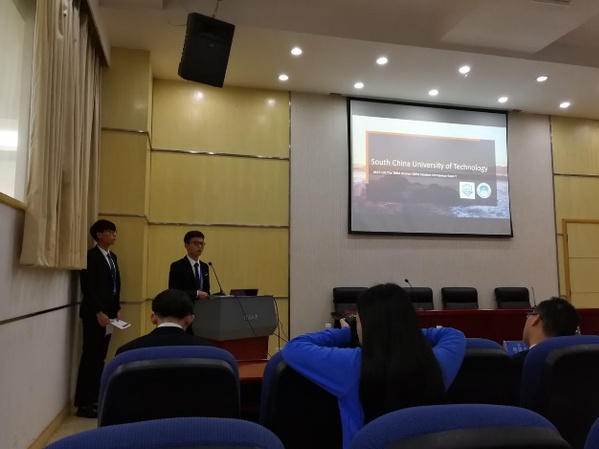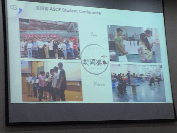 华南理工大学排在第8位进行汇报,来自15级工程管理班的林伟江同学和来自15级建筑工程2班的黄宇鹏同学,向大家展示了华南理工大学以及土木与交通学院的风采,接着汇报一年来华南理工大学ASCE学生分会概况及学生分会组织的相关活动等信息,得到了参会嘉宾们的认可和赞扬。