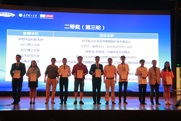 5月19日上午九点半,“PTV杯第十三届全国大学生交通科技大赛”闭幕式在长沙理工大学云塘校区大会堂举行,在闭幕式上,组委会公布了最终的获奖名单。来自16交工、交运的孙灼昕、杨雅云、石凌云、许少峰、李傥组荣获二等奖,来自15交运的李耀辉、林越、任杰组荣获三等奖。