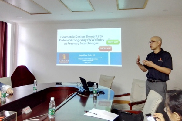 本次学术报告会由温惠英副院长主持。周华国教授做了题目为“Geometric Design Elements to Reduce Wrong-Way(WW) Entry at Freeway Interchanges”(重大逆行交通事故成因及对策研究)的学术报告,报告主要介绍了周华国教授过去十年在美国针对逆行交通事故的发生原因及对策的主要研究成果。周华国教授的报告分为三大部分:1、先介绍了美国近十年来逆行交通事故的特点及可能导致逆行交通事故的微观道路几何设计特征;2、紧接着介绍了在收集美国事故数据的基础上对逆行交通做的建模分析;3、在进行建模分析后,应该如何对美国交通管理部门提出减少逆行交通事故的交通改善对策。