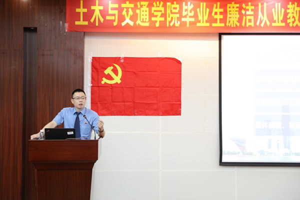 6月20日下午,土木与交通学院“2018届毕业生廉洁从业教育讲座暨法治宣传教育合作基地签约仪式”在交通大楼学术报告厅举行。本次活动特别邀请天河区人民检察院公诉科科长潘东检察官为师生党员授课。同时受邀出席活动的还有天河区人民检察院党组书记、代检察长林伟忠,党组成员、政工办主任尹圣川,学校校长助理、学院党委委员苏成教授,学校纪委副书记、监察处长、纪监办主任曾学敏。会议由学院党委副书记、纪委书记张蔚洁主持,学院2018届全体毕业生党员、学院相关领导负责人、学院关工委委员、退休教工支部老党员代表、各教工支部委员、专兼职辅导员等近200人参加了活动。