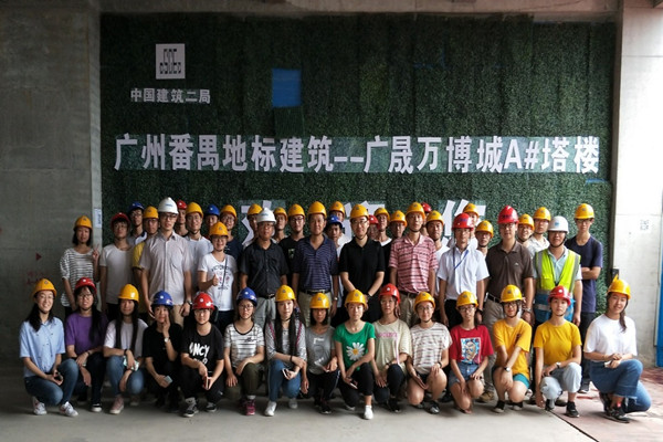 了解了万博商务区的整体规划和建设后,老师们和陈总工又带领同学们来到了位于万博商圈内的地标建筑物--广晟万博城A塔楼的施工工地现场。第一次来到工地的同学们,对周遭的事物感到新鲜与好奇,并且向工地的施工总监、项目总经理提出了很多工程施工方面的问题。该项目的负责人向同学们介绍了这栋楼的结构特点和施工中的一些亮点与突破,例如建设过程中廊桥的整体吊装技术等,让同学们了解到了工程建设中所用到的先进技术。