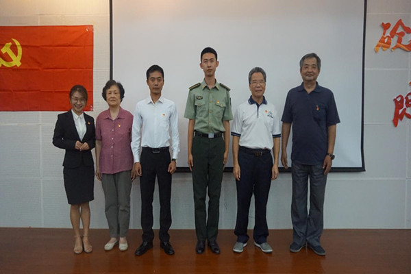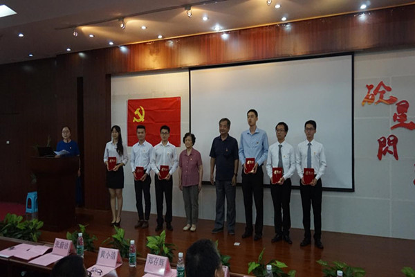 叶作楷老师、黄小清老师、王志勇老师为学生党员代表佩戴党徽并合影留念