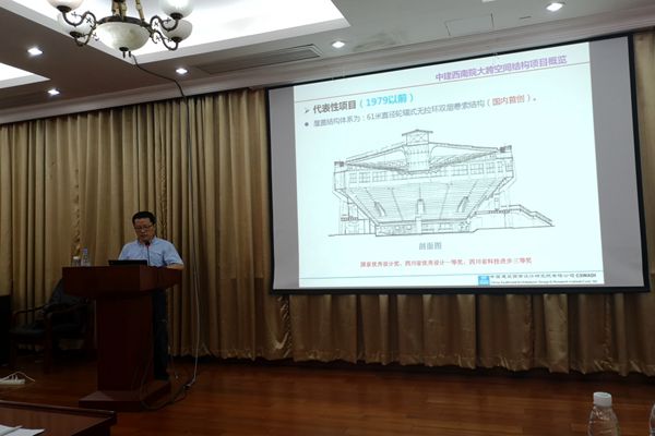 报告会上,刘宜丰总工首先对中建西南院建院以来的大跨空间结构工程进行了回顾,并对各年代的代表性工程做了简略介绍;其次重点讲解了江苏常州体育会展中心体育场和体育馆、江苏泰州体育中心体育场以及四川成都天府国际机场航站楼等几个代表性大跨工程屋盖结构的构思、选型及计算分析等工作;最后刘总与在座师生分享了其在大跨空间结构工程中的设计体会,总结了大跨空间结构设计中应重点关注的问题。报告会中刘总强调对结构设计工作的热情是结构创新的基础,而不断创新才能推动结构技术的进步。“热情不止,创新不断!”刘宜丰总工用这八个字与在座师生共勉后结束演讲。