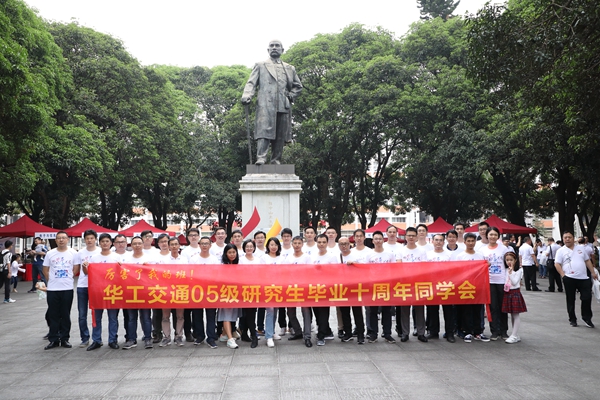 当日上午班级各个专业的校友在中山像前汇合、拍照,联谊活动逐渐拉开序幕。虽然大家专业背景不同,但丝毫不影响浓浓的同窗之情,个个畅所欲言、忆往事、谈笑风生。经历10年悠悠岁月再次重逢,见面就用有力的拥抱表达了当年真挚的情感从未变过。中山像前集体拍照留念后,校友们由中山像出发开启重走校园路之旅:中山像——1号楼——励吾科技楼——34号教学楼——西湖苑、西湖厅——中区篮球场——西二十——土木与交通学院,最后齐集交通大楼并邀请了当年班主任拍照留念。