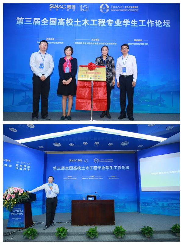 论坛协作单位——融创中国控股有限公司执行总裁薛雯在致辞介绍了公司企业文化和人才战略,希冀通过论坛的平台,深化合作,加强校企联动,创新人才培养模式。华南理工大学学生工作部(处)李卫青部(处)长与土木与交通学院吴波院长代表本届论坛承办方与融创集团负责人一起举行了人才培养基地揭牌仪式。