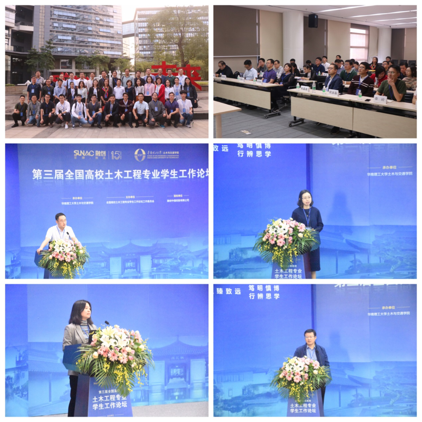 11月13日—14日,第三届全国高校土木工程专业学生工作论坛在华南理工大学召开。来自同济大学、清华大学、哈尔滨工业大学、东南大学、上海交通大学、大连理工大学、河海大学、浙江大学、中南大学、西安建筑科技大学等27所高校土木工程专业的学院党委副书记、团委书记、学工办主任、辅导员近60人参会。华南理工大学党委副书记余其俊、融创中国控股有限公司执行总裁薛雯等领导嘉宾出席了13日上午的论坛开幕式。