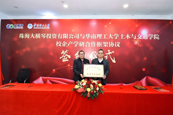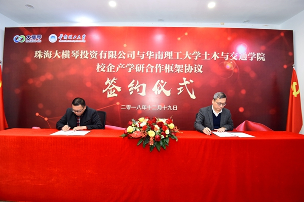 2018年12月19日上午,华南理工大学土木与交通学院与珠海大横琴投资有限公司校企产学研合作框架协议签字仪式在横琴总部大厦举行。土木与交通学院党委郑存辉书记、张蔚洁副书记、陈珺副院长、李静副教授等一行,珠海大横琴投资有限公司胡嘉董事长、田伟书记、肖时辉总裁、钟丽红总监以及公司各部门负责人等一行共同出席了签约授牌仪式。