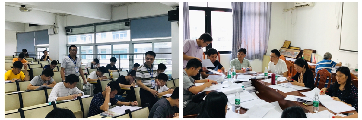 图3 领导视察考场 图4 各校教师代表批改考卷