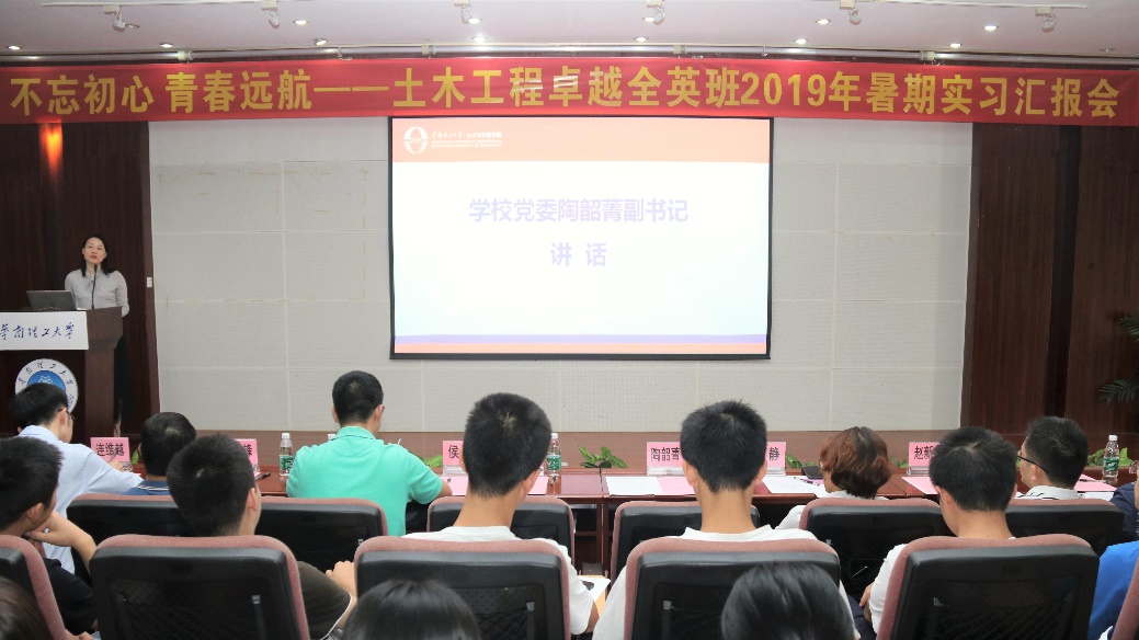 10月27日下午,土木与交通学院土木工程卓越全英班2019年暑期实习汇报会在交通大楼学术报告厅顺利举行。学校党委副书记陶韶菁,学院副院长季静作为“不忘初心、牢记使命”主题教育本科生班级联系领导出席了汇报会,学院土木工程系负责人,班级辅导员、班主任,各年级土木全英班全体同学参加了汇报会。