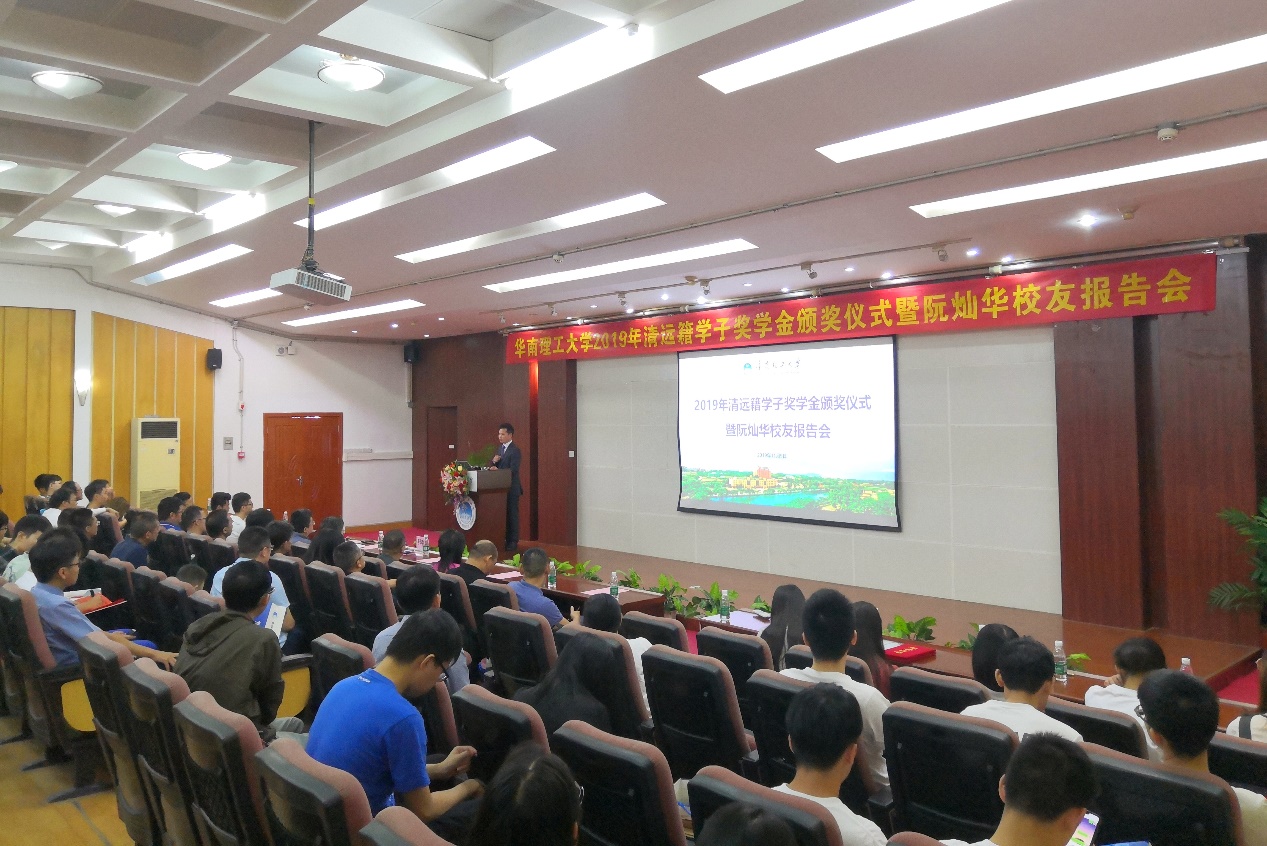 11月9日校友返校日之际,华南理工大学 “清远籍学子奖学金”颁奖仪式暨阮灿华校友报告会在交通大楼报告厅举行。会上,土木与交通学院工程力学系90届校友、清远市恒福地产董事长阮灿华先生向学校捐资100万元,设立校友奖学金,助力母校教育事业发展。这是继阮灿华校友此前捐资200万元设立“清远籍学子奖助学金”,合作捐资设立“90力学同学会奖助学金”之后,再次慷慨捐赠。学校学生工作部(处)副部(处)长李华兵,土木与交通学院党委书记郑存辉,副院长姚小虎,副院长陈珺出席了会议。各届校友代表,各专业师生代表参加了会议。