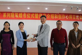 活动首项是赠书仪式。关教授向华南理工大学图书馆和土木与交通学院捐赠他的著作“路上”系列随笔五套。华南理工大学图书馆副馆长乔丽、土木与交通学院郑存辉书记、温惠英副院长以及马莹莹老师接受赠书并合影留念。
