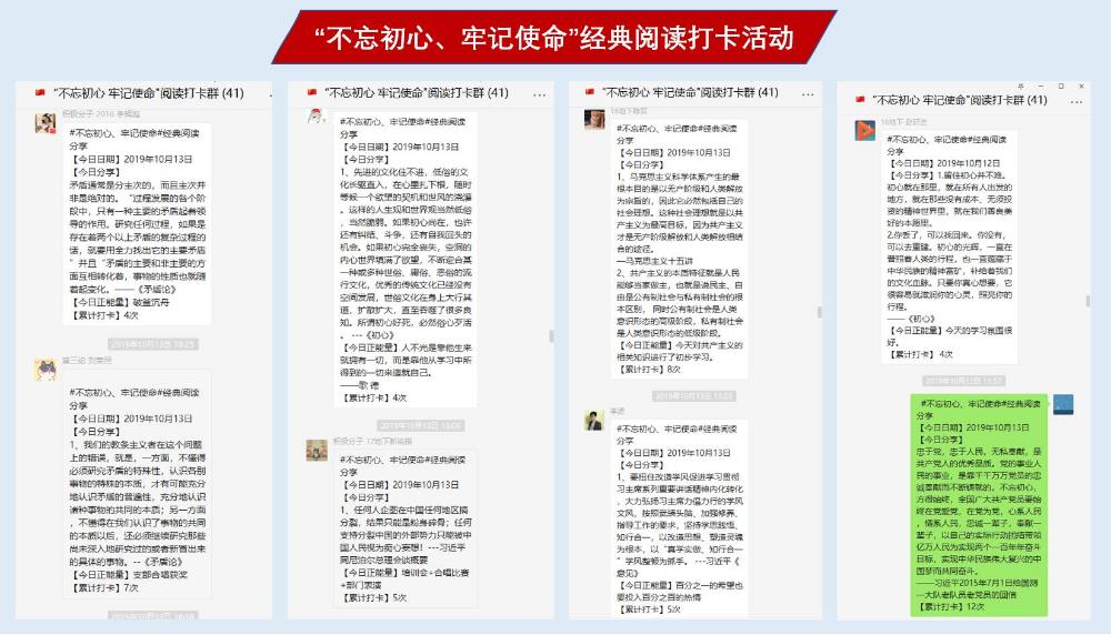 今年9月份,党支部启动了“不忘初心、牢记使命”经典阅读打卡活动。党员、积极分子们选择了《习近平关于“不忘初心、牢记使命”论述摘编》、《习近平谈治国理政》、《资本论》、《顶天立地谈信仰》等10余种经典书籍,读原著、学原文、悟原理,通过个人通读、集体诵读、小组研讨,结合微信“打卡”,全员参与,将理论学深悟透。这次读书会,是对阅读“打卡”活动的集中总结,也是一次思想的碰撞和升华。