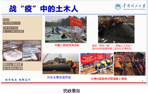 把思政教育巧妙地融入课程教学中,将火神山、雷神山的建设与土木工程专业、流体力学课程紧密联系起来,激发同学们学习流体力学课程的兴趣,增强同学们对土木工程专业的自豪感。要求同学们写下疫情下的思考,组织了一场课外专题思政讨论课,同学们积极参与、反应热烈,培养了同学们的爱国主义思想情操,树立人与自然和谐相处理念,抒发了同学们对战疫中涌现出来的英雄们的崇高敬意。