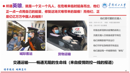 卢凯老师和黄玲老师在开展课程教学时,结合当下非常战“疫”实时情况,带领同学们一起学习了习近平主席重要讲话“信心百倍地打好这场阻击战、总体战,打好这一场人民战争。我们一定要树立信心,一定会胜利的。”并结合高松校长对全校学生的寄语“学习力、思想力和行动力的结合,才能够形成理性的判断和有意义的实践,才能够面对未来不确定性的挑战,更有信心和勇气。”引导同学们进行进一步思考与讨论。不仅如此,卢凯老师结合《交通控制与管理》中的课程内容,分享了来自疫情防控一线“交通运输——畅通无阻的生命线”、“他们是可爱的交通人”等的报道,加深了同学们对交通专业的认同感,也让同学们对于时代英雄的解读有了更加全面直观的认识;黄玲老师就《公共交通系统》课程内容分别从系统角度和专业角度出发,探讨了人与自然的关系以及公共交通在疫情防控环境下如何做防疫的设想,让同学们更加有了为国奉献的责任担当。