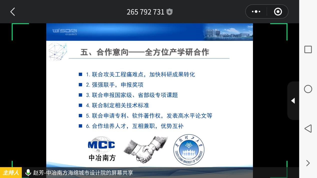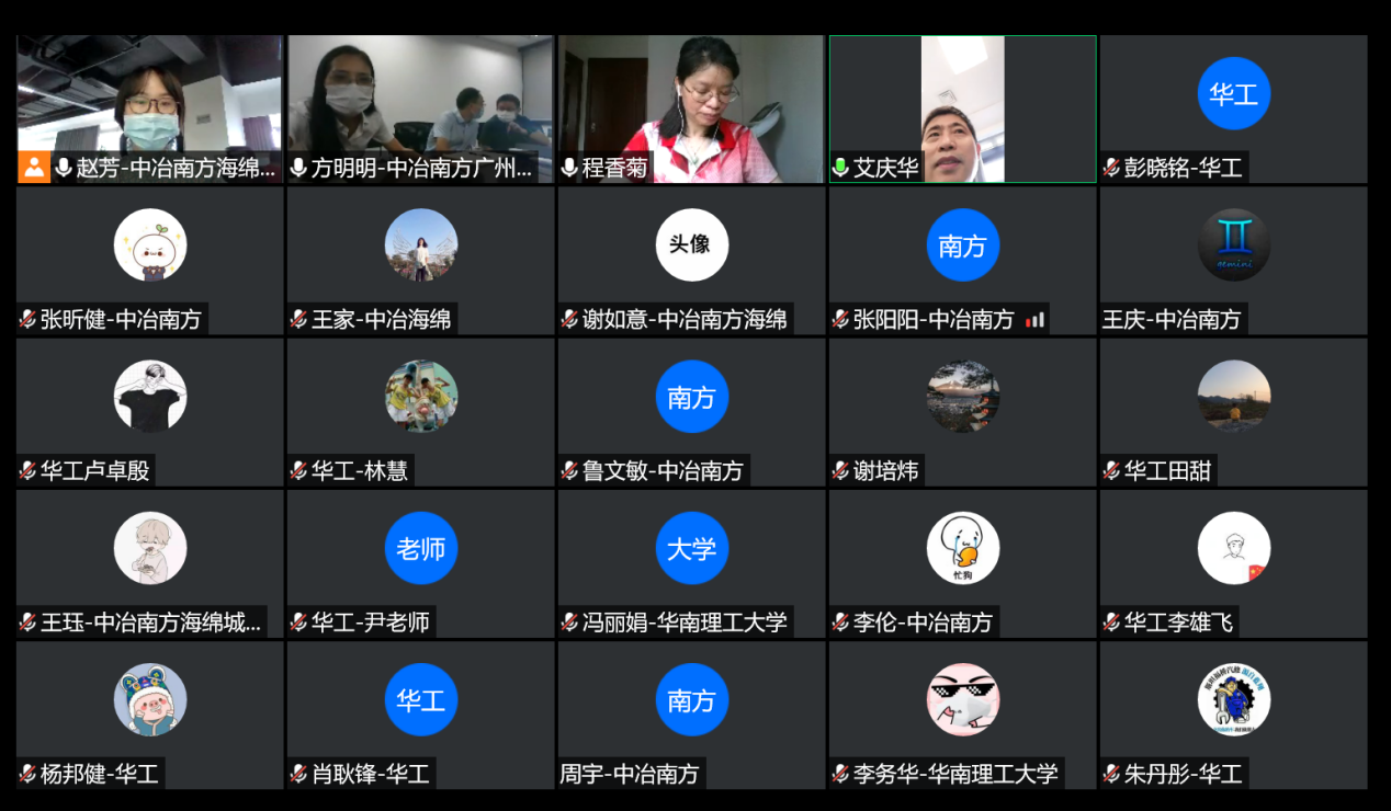 2020年5月15日上午,中国中冶海绵城市技术研究院及中冶南方城市建设工程技术有限公司与华南理工大学土木与交通学院水利工程系程香菊教授团队通过网络视频会议双方进行了深入交流,与会人员包括中国中冶海绵城市技术研究院技术标准部部长、中冶南方城市建设工程技术有限公司海绵城市设计院院长艾庆华、中冶南方城市建设工程技术有限公司广州设计院方明明及中冶南方城市建设工程技术有限公司海绵城市相关工作人员、华南理工大学土木与交通学院水利工程系主任程香菊教授、郭振仁教授、尹小玲副教授以及博士后、博士生、硕士生共30余人。整个会议时长近三小时,主要围绕中冶海绵城市建设经验、华工水利工程系程香菊教授团队工作介绍以及就双方开展工作寻求合作的共同点,会议在轻松愉快中进行,双方达成了强烈合作的共识,并有意向开展细化与深入的合作。