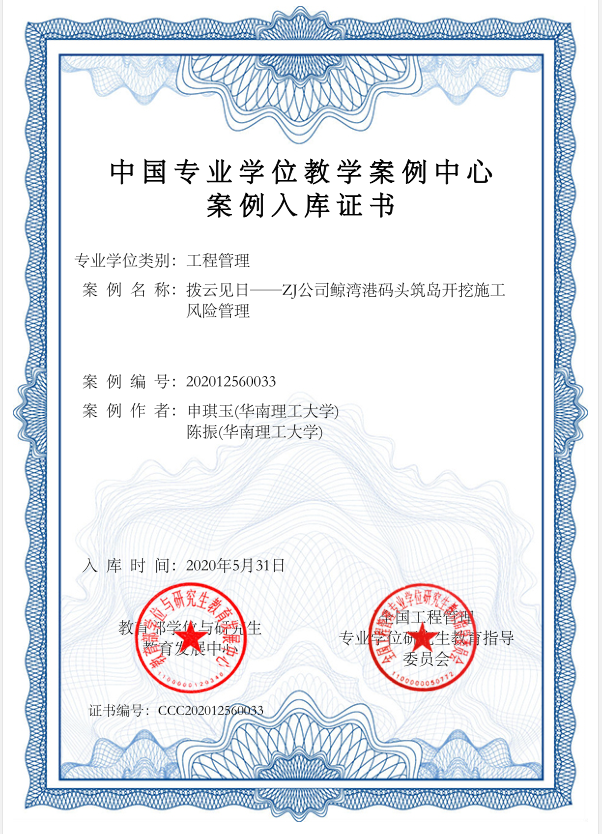 近日,在教育部学位与研究生教育发展中心和全国工程管理专业学位研究生教育指导委员会合作举办的第四批全国工程管理硕士(MEM)专业学位教学案例征集中,华南理工大学土木与交通学院工程管理系申琪玉老师和硕士研究生陈振编写的《拨云见日——ZJ公司鲸湾港码头筑岛开挖施工风险管理》案例成功入选中国专业学位教学案例中心案例库。这是土木与交通学院首个入选中国专业学位教学案例中心工程管理专业学位案例库的教学案例。
