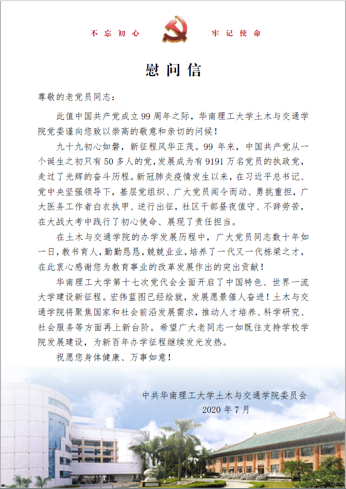 华南理工大学土木与交通学院党委致老党员的慰问信