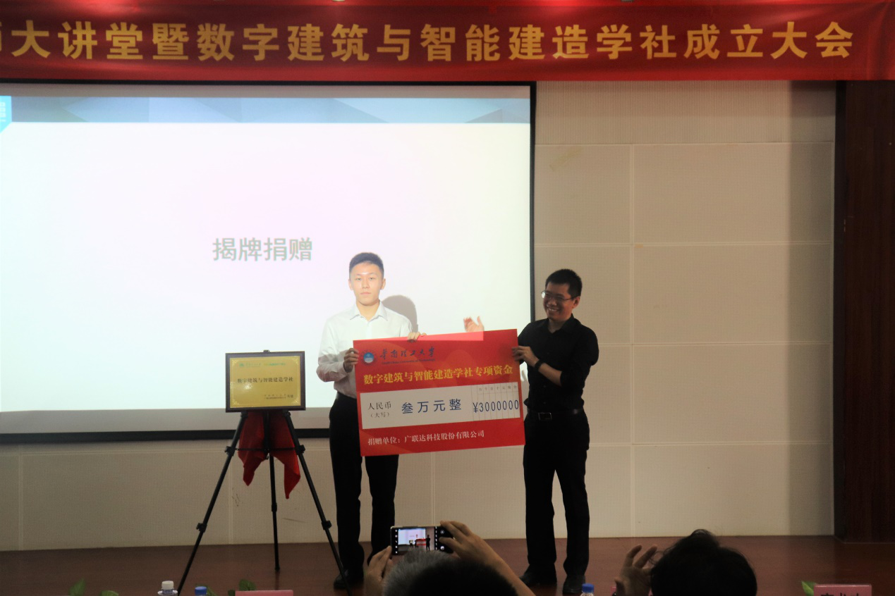 最后,王磊副书记与洪涛总经理共同为学社揭牌,同时洪涛总经理代表广联达公司为学社捐赠三万元专项基金。相信双方的合作将互利互惠,共赢进步,为社会的发展做出更大的贡献!