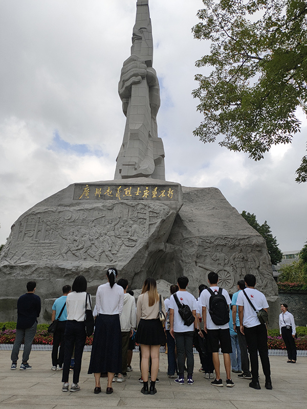 2020年11月21日上午,在讲解员的带领下,参加活动的全体师生首先参观了广州起义纪念碑。广州起义纪念碑造型是一只巨手,紧握步枪,冲开三块大石直指苍穹,象征广州起义的英雄们高举武装斗争的旗帜,冲破压在人民头上的三座大山。四周生动形象的浮雕分别反映广州起义前的筹划、起义时攻打国民党政府公安局、庆祝广州苏维埃政府成立、观音山之战和向农村转移,重现了那段惨烈却辉煌的历史。广州起义虽因敌我力量悬殊而失败,却是创建人民政权的一次伟大尝试,它和南昌起义、秋收起义连接在一起,成为中国共产党独立领导革命战争和创造人民军队的伟大开端。全体师生在纪念碑前肃立默哀,深切悼念广州起义中壮烈牺牲的烈士。