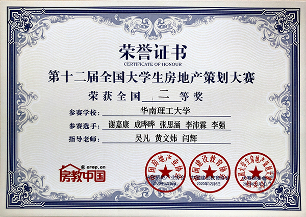 2020年荣誉榜——喜报!我校学子获第十二届全国大学生房地产策划大赛全国总决赛二等奖